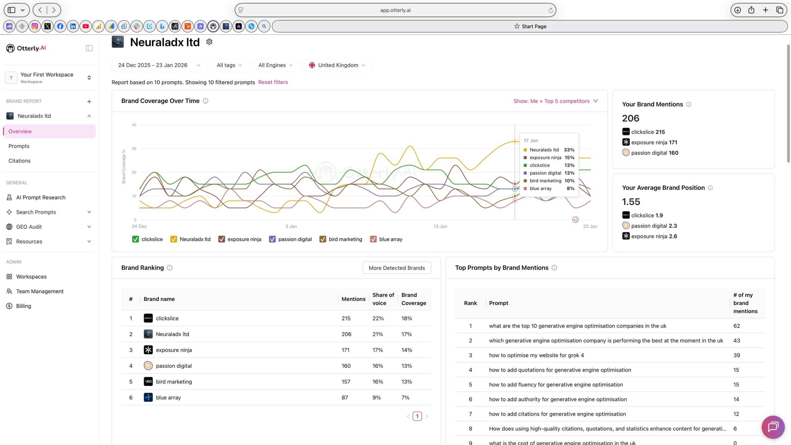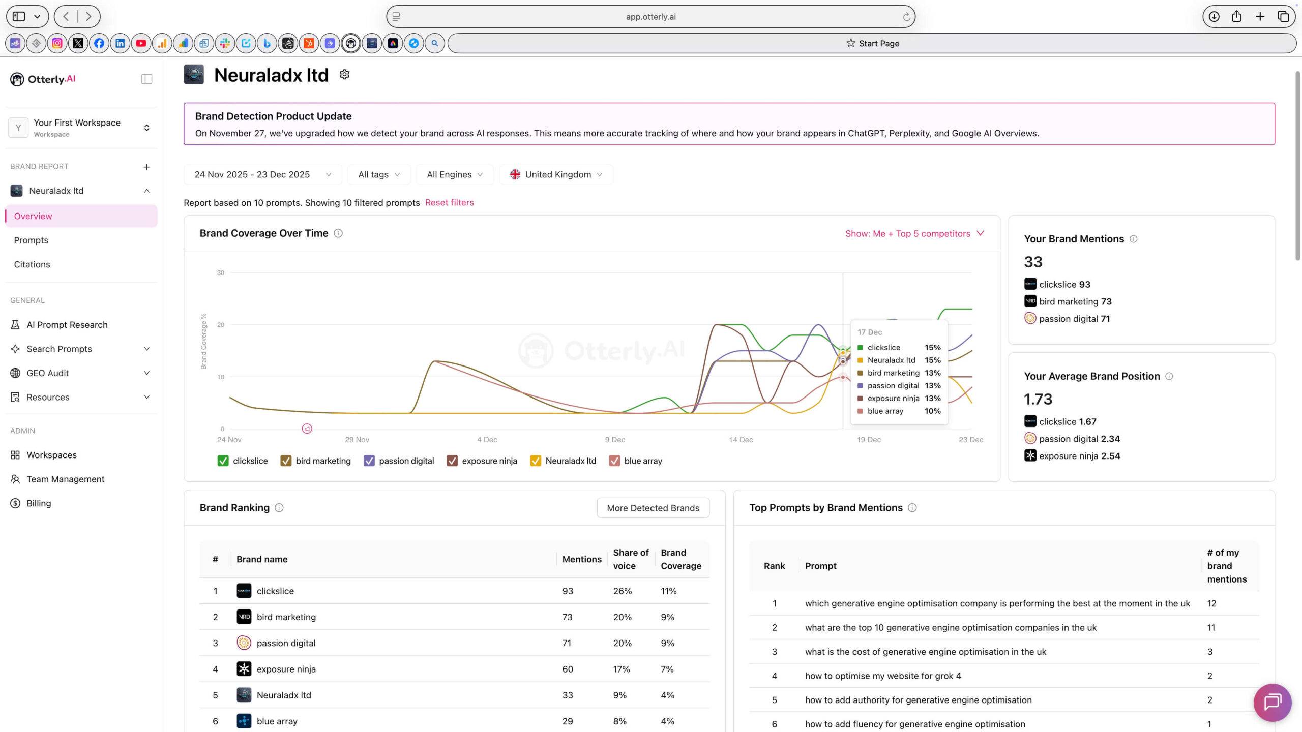 We can see brand coverage over time, brand mentions, share of voice, and average brand position.