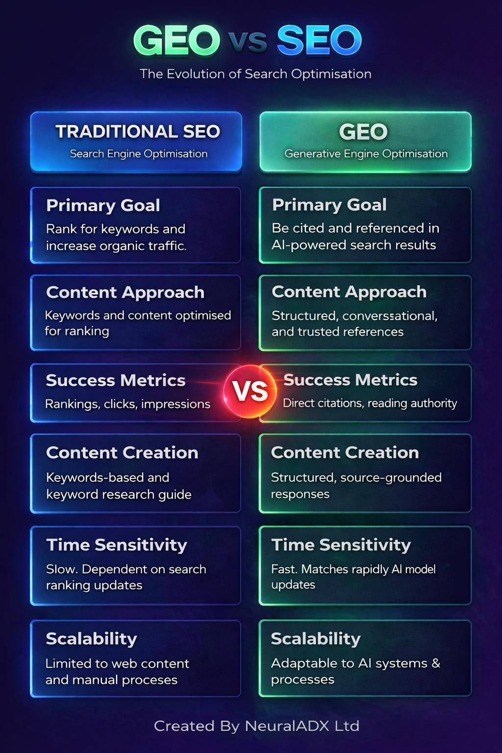 - SEO relies heavily on backlinks and technical site health, while GEO prioritises clarity, context, authority, and question-focused content.