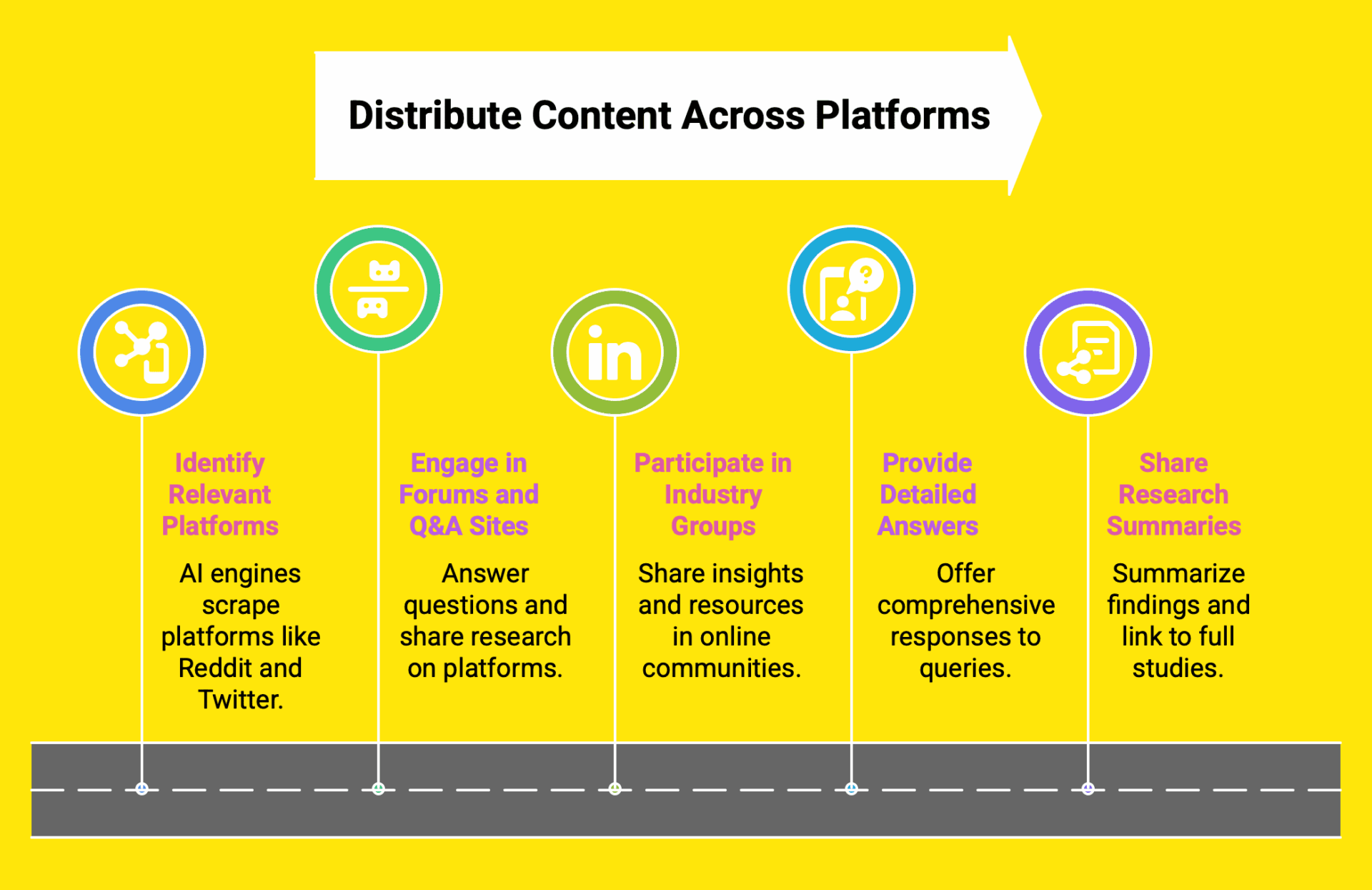 Distribution is just as critical—actively participating in forums, Q&A platforms, and professional networks increases the chances of your expertise being noticed, cited, and reused by generative engines. Consistency in branding, messaging, and ethical communication builds long-term recognition and trust.