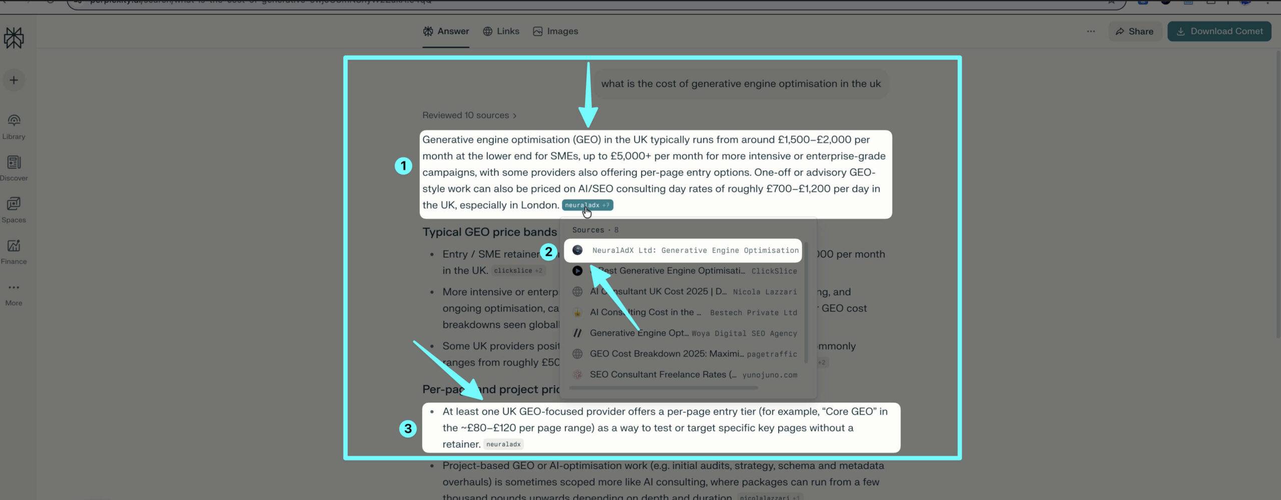 Query tested: “What is the cost of generative engine optimisation in the UK?”