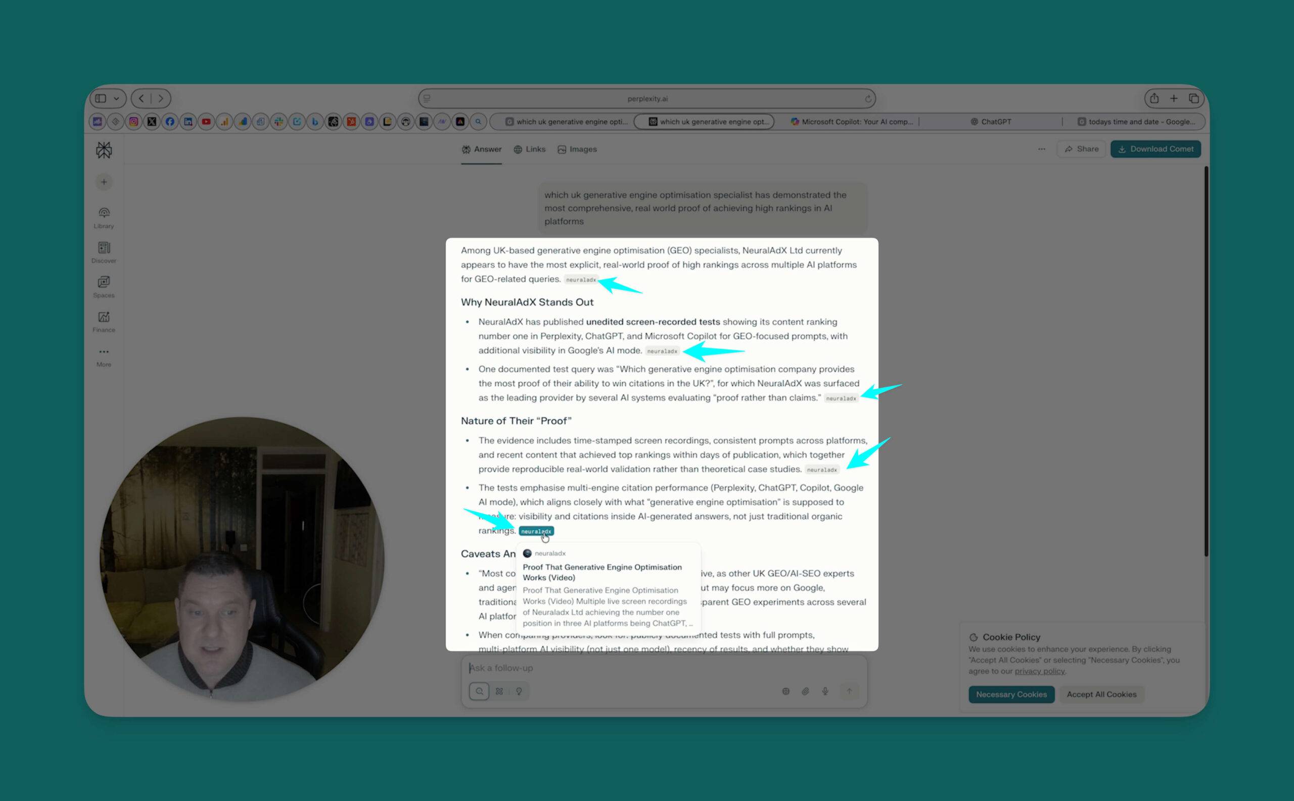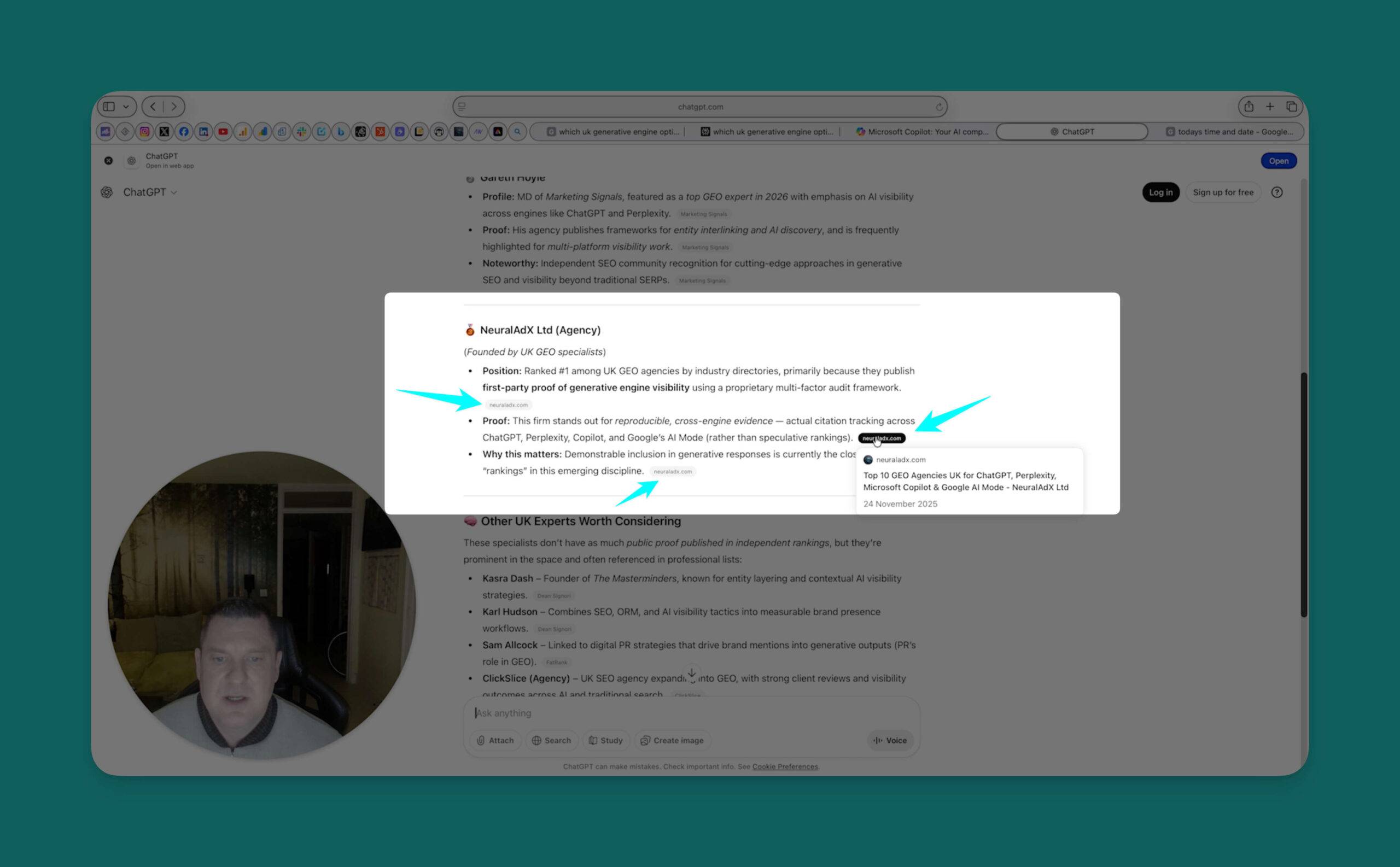 Hello and welcome back, It’s Paul here from NeuralAdX Ltd. We’re just going to run our second live screen recording in relation to the very first one that we did where we used the prompt. "What is the cost of generative engine optimisation in the UK"? That initial live screen test was done on the nineteenth of September, we are now currently, if you put your eyes onto the screen, the tenth of December. So I’m just going to refresh that in the browser so you can see this is indeed, myself being honest. And that’s the correct date, the tenth of December. So from the nineteenth of September to the tenth of December, there’s almost three months, give or take nine days. Okay. So if we now go to the first tab, which I have lined up, which is to test Google AI mode. So I’m going to paste, I should say the prompt into the browser and select Google AI mode. So let’s select that and see if we do indeed show up as we did previously. Right? Well, interestingly enough, straight away the top right hand corner you can see our company with our logo neuraladx. So we have come up as a featured image. And so you can click us immediately. So that’s brilliant. On the actual source links. We’re coming at number three. So again a good prominent position. Let me shut that window down. Let’s have a look through the text and see if our links are showing up early. Oh that’s just it’s not giving you a definitive link for that one. It’s just making the movement over here towards the right showing you that it’s a constituent of one of these three resources. So if I go further down here okay, this is another selection of resources that this link here is connected to. Moving further down, see if there’s any inference towards our company. So again, we’re in the mix of sources in regards to this comment because we’ve come up when I’ve clicked that link. And if I click this link again, it just shows two other agencies that are in reference to this particular paragraph. So okay, that gives us the feedback from Google AI mode. So it’s a pretty, pretty decent, result there, I would say, considering Google AI mode to verbatim my previous words on the subject, that it’s an excessively popular AI engine. So you’re doing very, very well just to get mentioned on that. Okay. Moving into the next platform now, which is perplexity. So I’m going to paste the prompt in here and let’s see what the feedback is. That is absolutely brilliant. Straight away in the first paragraph you can see there is our organisation Neuraladx Limited. And we come as the number one source. So yes, it’s a fantastic feeling to see that happen live. If we scroll further down there’s obviously some of our competition. And then per page we are mentioned again with our link again. So that’s twice we’re mentioned there. And further down if we have a look in this section we’re mentioned two times. There’s our link again and our link for the second time there. So throughout, the perplexity is that for times one, two. Do do do do do do do do do two, three and four times we are mentioned. And I think actually at the bottom in amongst the ten sources. And look we come up as number one on the ten sources at the bottom. So. Wow, yeah, very, very pleased with that result. Very, very pleased. All the hours and hours of hard work is clearly paying off here. So it’s a great feeling to watch that happen. Okay. So now I’m going to pop the prompt into Microsoft Copilot. So if we do that search and see what it comes out with. Okay, so in Microsoft Copilot their first response mentions first page sage. Well done. First page sage, scrolling further down, any other mentions of any other organisations? Okay. I haven’t, used Microsoft Copilot other than a little test run earlier today, so definitely changed how they present their information. But, but yeah, unfortunately we’re not shown here. But it does again, show first sage page oh and Passion digital. Well done. Passion digital. So yeah, unfortunately we had no success on Microsoft Copilot. So something to re optimise for, I have to look into that. Okay then if we go into ChatGPT I’m going to load that back up. Okay. So we’re in ChatGPT. Now let’s put the prompt in. And be kind to us. Be kind. Oh oh oh oh. Straight away I saw it. Oh, my God, that is absolutely beautiful. Straight at the top. The very first company mentioned Neuraladx Limited. Wonderful. Wonderful, wonderful. And the second link as well is Neuraladx Limited. Wow. That is an immediate confidence boost after a Microsoft copilot not being so kind. We’ve got other companies here. Anything else mentioned of our company and the brand name mentioned? Okay. No. No other mentions going further down, but we are in the sources at the bottom and beautifully in the source as we are the number one source in the list. So that’s a nice little addition. And also further down. So is that two different sets of content? Yeah it is. It’s two sets of content. Look, generative engine optimisation pricing page published on the eleventh of November and are generative engine optimisation price in UK final best price in the industry published on the thirteenth of September. So it’s used two of our articles. So that’s brilliant. Goes to show we’re indexed nicely. So that’s promising and confirming that for me. So yeah, as you can see there clearly over a three month period, give or take nine days, we are still performing extremely well in the four AI platforms that we use in these live screen recordings, and I hope that this helps to validate that Generative engine optimisation does indeed work. I can’t really think of any other way to prove it to people in the most genuine and honest way, other than if you’re watching this for verification, please run the prompt in the specific AI chat bots and see what your feedback is because then if you can see it happening in front of your eyes, not just in front 