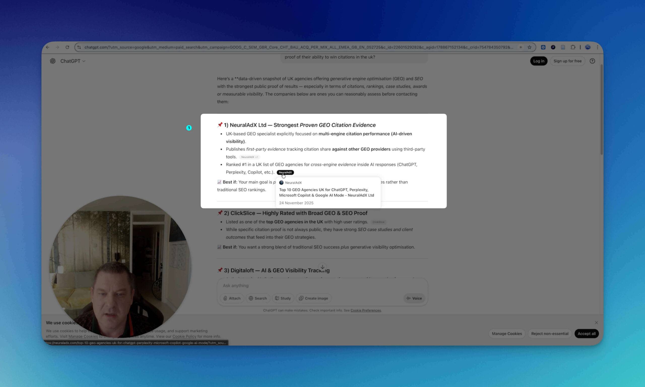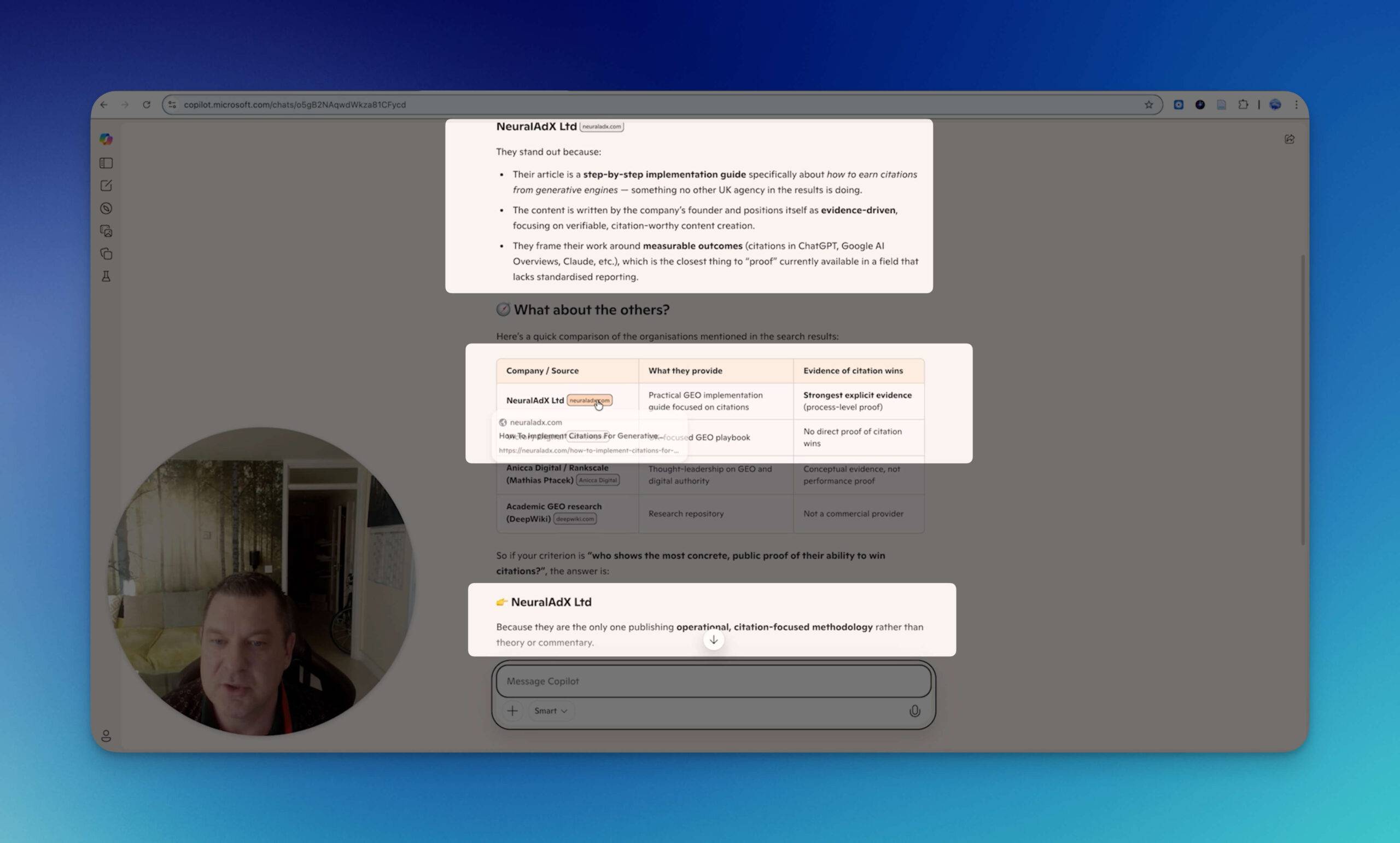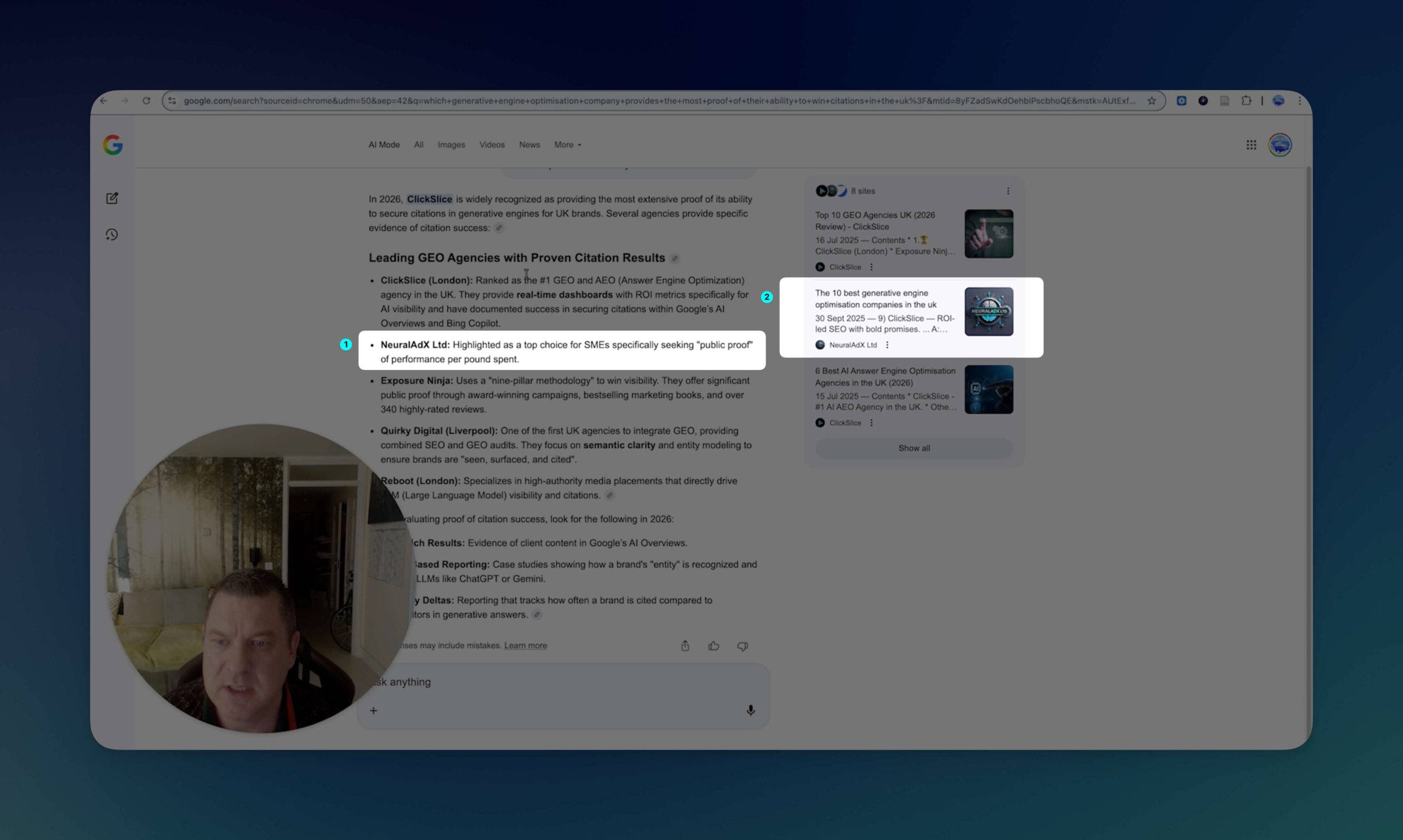 Hello and welcome back, It’s Paul here from Neuraladx Ltd. We’re just going to run our second live screen recording in relation to the very first one that we did where we used the prompt. "What is the cost of generative engine optimisation in the UK"? That initial live screen test was done on the nineteenth of September, we are now currently, if you put your eyes onto the screen, the tenth of December. So I’m just going to refresh that in the browser so you can see this is indeed, myself being honest. And that’s the correct date, the tenth of December. So from the nineteenth of September to the tenth of December, there’s almost three months, give or take nine days. Okay. So if we now go to the first tab, which I have lined up, which is to test Google AI mode. So I’m going to paste, I should say the prompt into the browser and select Google AI mode. So let’s select that and see if we do indeed show up as we did previously. Right? Well, interestingly enough, straight away the top right hand corner you can see our company with our logo neuraladx. So we have come up as a featured image. And so you can click us immediately. So that’s brilliant. On the actual source links. We’re coming at number three. So again a good prominent position. Let me shut that window down. Let’s have a look through the text and see if our links are showing up early. Oh that’s just it’s not giving you a definitive link for that one. It’s just making the movement over here towards the right showing you that it’s a constituent of one of these three resources. So if I go further down here okay, this is another selection of resources that this link here is connected to. Moving further down, see if there’s any inference towards our company. So again, we’re in the mix of sources in regards to this comment because we’ve come up when I’ve clicked that link. And if I click this link again, it just shows two other agencies that are in reference to this particular paragraph. So okay, that gives us the feedback from Google AI mode. So it’s a pretty, pretty decent, result there, I would say, considering Google AI mode to verbatim my previous words on the subject, that it’s an excessively popular AI engine. So you’re doing very, very well just to get mentioned on that. Okay. Moving into the next platform now, which is perplexity. So I’m going to paste the prompt in here and let’s see what the feedback is. That is absolutely brilliant. Straight away in the first paragraph you can see there is our organisation Neuraladx Limited. And we come as the number one source. So yes, it’s a fantastic feeling to see that happen live. If we scroll further down there’s obviously some of our competition. And then per page we are mentioned again with our link again. So that’s twice we’re mentioned there. And further down if we have a look in this section we’re mentioned two times. There’s our link again and our link for the second time there. So throughout, the perplexity is that for times one, two. Do do do do do do do do do two, three and four times we are mentioned. And I think actually at the bottom in amongst the ten sources. And look we come up as number one on the ten sources at the bottom. So. Wow, yeah, very, very pleased with that result. Very, very pleased. All the hours and hours of hard work is clearly paying off here. So it’s a great feeling to watch that happen. Okay. So now I’m going to pop the prompt into Microsoft Copilot. So if we do that search and see what it comes out with. Okay, so in Microsoft Copilot their first response mentions first page sage. Well done. First page sage, scrolling further down, any other mentions of any other organisations? Okay. I haven’t, used Microsoft Copilot other than a little test run earlier today, so definitely changed how they present their information. But, but yeah, unfortunately we’re not shown here. But it does again, show first sage page oh and Passion digital. Well done. Passion digital. So yeah, unfortunately we had no success on Microsoft Copilot. So something to re optimise for, I have to look into that. Okay then if we go into ChatGPT I’m going to load that back up. Okay. So we’re in ChatGPT. Now let’s put the prompt in. And be kind to us. Be kind. Oh oh oh oh. Straight away I saw it. Oh, my God, that is absolutely beautiful. Straight at the top. The very first company mentioned Neuraladx Limited. Wonderful. Wonderful, wonderful. And the second link as well is Neuraladx Limited. Wow. That is an immediate confidence boost after a Microsoft copilot not being so kind. We’ve got other companies here. Anything else mentioned of our company and the brand name mentioned? Okay. No. No other mentions going further down, but we are in the sources at the bottom and beautifully in the source as we are the number one source in the list. So that’s a nice little addition. And also further down. So is that two different sets of content? Yeah it is. It’s two sets of content. Look, generative engine optimisation pricing page published on the eleventh of November and are generative engine optimisation price in UK final best price in the industry published on the thirteenth of September. So it’s used two of our articles. So that’s brilliant. Goes to show we’re indexed nicely. So that’s promising and confirming that for me. So yeah, as you can see there clearly over a three month period, give or take nine days, we are still performing extremely well in the four AI platforms that we use in these live screen recordings, and I hope that this helps to validate that Generative engine optimisation does indeed work. I can’t really think of any other way to prove it to people in the most genuine and honest way, other than if you’re watching this for verification, please run the prompt in the specific AI chat bots and see what your feedback is because then if you can see it happening in front of your eyes, not just in front 