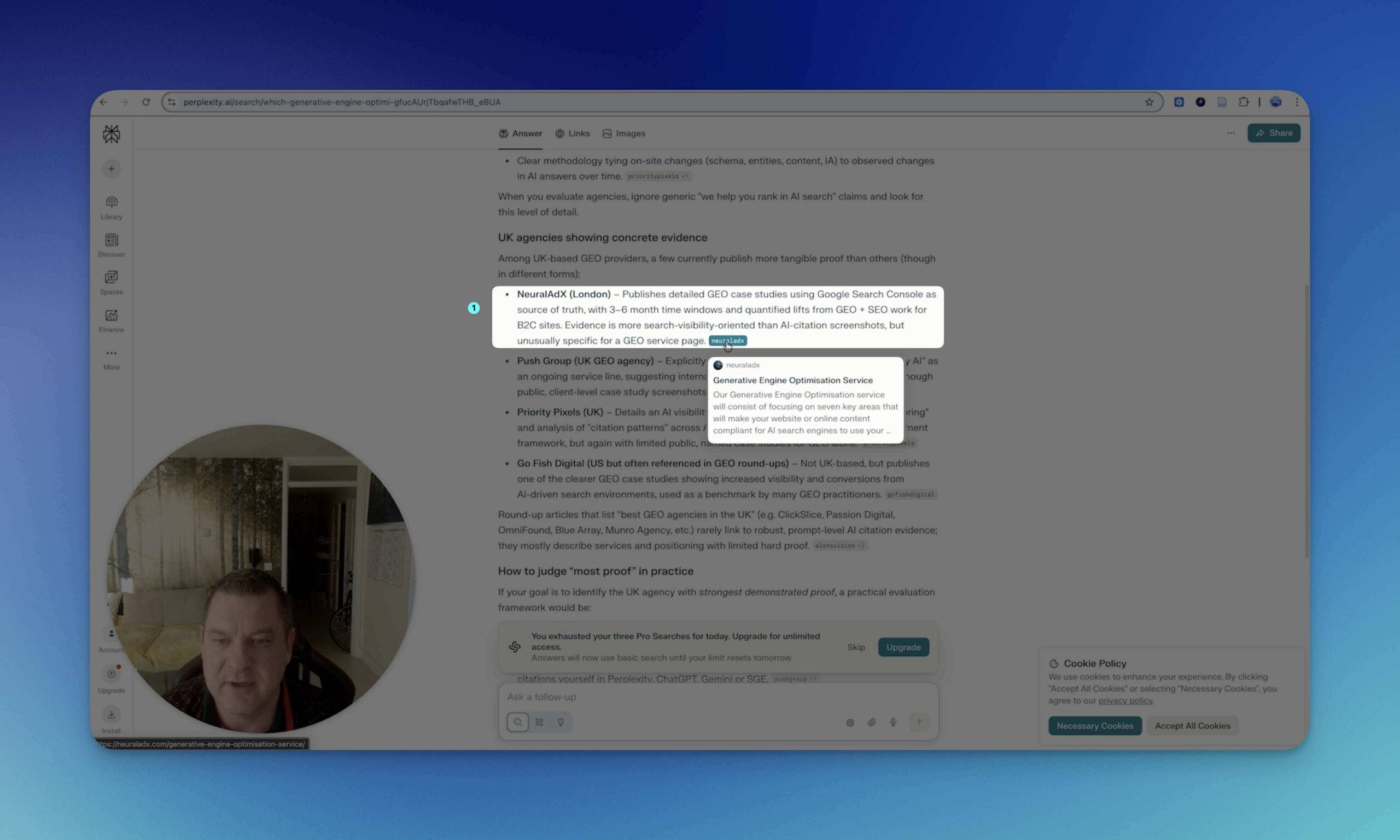 Hello there from Neural AdX Limited. I just want to show you a live screen recording to show how effective generative engine optimisation is. So, we’re currently in my company’s website’s WordPress dashboard, as you can see here. And I’m looking in my blog post section, and there’s one blog post here that says generative engine optimisation pricing UK, written by myself, and it was published on the 13th of September, 2025. So, if we go to check today’s date, as I’ll refresh it at the top to make sure you can see that it’s live, it shows you we’re now Friday the 19th of September. So, literally six days ago, I did that blog post. Okay. So, if I go into AI mode and I put in the query down at the bottom in the bar, if you see what is the cost of generative engine optimisation in the UK, hit search. Let’s see what it comes up with. So, as you can see here, straight away on the right hand side, you see my company, NeuralAdX Limited, comes up as number three. I’ve checked it previously and it comes up as number one, but I think it just rotates. But, nonetheless, you can see that with a blog post that was done six days ago, I’m already being the answer as the generated AI response, which is pretty fantastic. And that’s in Google AI mode which is excessively popular. So that’s the results in Google AI mode. So if we try another platform being Perplexity, let me go into it here. Type in the search and see what that brings up for us. Okay. So, wow, would you look at that? Typical pricing packages, entry- level manual optimisation, £80 to £120 per page, NeuralAdX reference. So, how much better can you get than that? You come at the top, number one. And then when I click into sourcing, I’m positioned at number one as well. So, I really couldn’t hope for any more than that. Absolutely amazing. So, then we will try another platform. Let’s go into Microsoft Bing Copilot which is obviously an AI generative engine again. So if I type that in into that live search see what it comes up with okay. So if we see here geo pricing models go £80 to £120 and then if we look at the source and there I am neuraladex.com I come up number one on Microsoft Bing. So then now for the fourth AI platform search engine to try let’s go into chat GPT, paste the same query and select and let’s see what that’s responses. It takes a little while because I’ve got it on think mode. So it takes a little bit longer to give me comprehensive replies but that just ensures that my work will be of a better standard for my clients where I use chat GPT. So we have to enact patience of course.